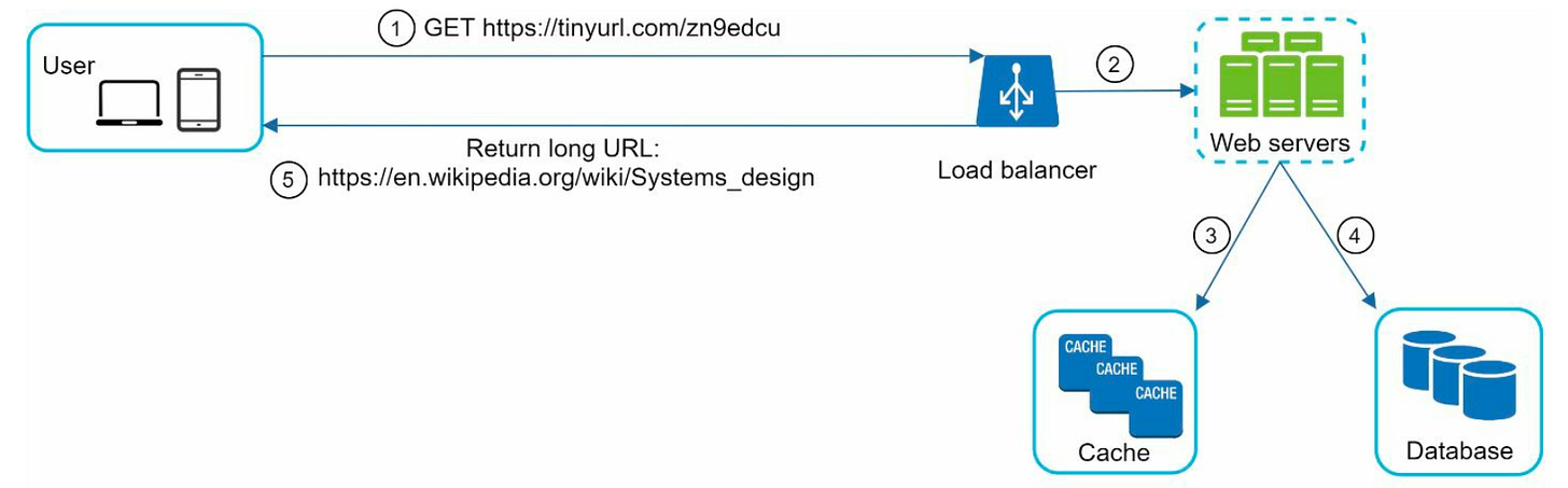 We would persist an unique id, short URL and a long URL in a distributed database. When user requests for a long URL it goes to web server which checks in cache if it exists return else it would go to database to fetch long URL